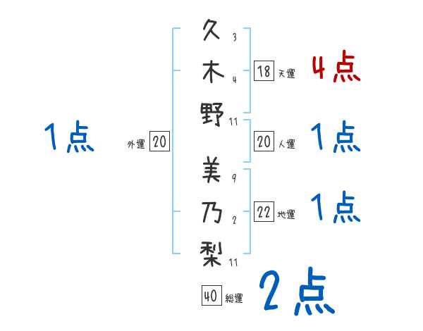 天運![]() | 久木野美乃梨さんの天運は18画の4つ星!情熱的で剛気。忍耐力があり信頼される。 家系が持つ宿命的な運勢を表します。祖先から受け継いだ苗字ですので自分の力が及びません。家柄を象徴します。 |