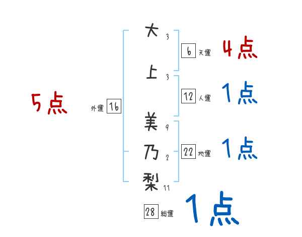 天運![]() | 大上美乃梨さんの天運は6画の4つ星!慎重な努力家で信頼を得る。誠実な精神で向上心に優れる。 家系が持つ宿命的な運勢を表します。祖先から受け継いだ苗字ですので自分の力が及びません。家柄を象徴します。 |