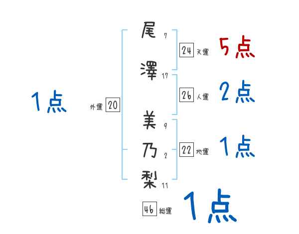 天運![]() | 尾澤美乃梨さんの天運は24画の5つ星!家庭運が良く順調な人生。金運にも恵まれる。 家系が持つ宿命的な運勢を表します。祖先から受け継いだ苗字ですので自分の力が及びません。家柄を象徴します。 |