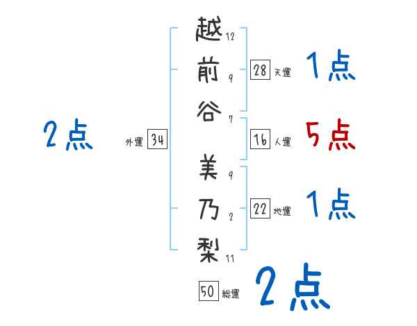 人運![]() | 越前谷美乃梨さんの人運は16画の5つ星!人望が厚く大きく発展する。逆転成功が見える。 性格や才能などを表す2番目に重要な運勢です。人間関係や協調性、社会的な成功に影響します。主に20歳から50歳ぐらいまでの中年期の運勢を表します。 |