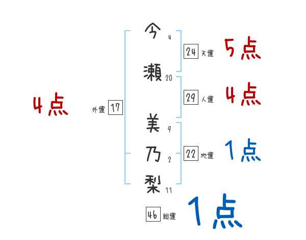 外運![]() | 今瀬美乃梨さんの外運は17画の4つ星!積極的な行動力。地位を気づき財産を手に入れる。純粋な心と直感力。 生活面を象徴する運勢です。外部から受ける影響力を表し、結婚運、家庭運や職場、環境への順応性を表します。 |