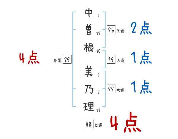 外運![]() | 中曽根美乃理さんの外運は29画の4つ星!完全主義で才能がある。厳格な心の持ち主。 生活面を象徴する運勢です。外部から受ける影響力を表し、結婚運、家庭運や職場、環境への順応性を表します。 |