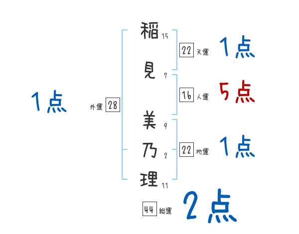 天運![]() | 稲見美乃理さんの天運は22画の1つ星!努力することが苦手ないっぽう手先が器用。芸術性にも優れる。 家系が持つ宿命的な運勢を表します。祖先から受け継いだ苗字ですので自分の力が及びません。家柄を象徴します。 |