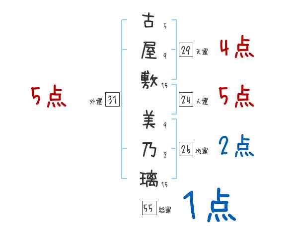 天運![]() | 古屋敷美乃璃さんの天運は29画の4つ星!完全主義で才能がある。厳格な心の持ち主。 家系が持つ宿命的な運勢を表します。祖先から受け継いだ苗字ですので自分の力が及びません。家柄を象徴します。 |