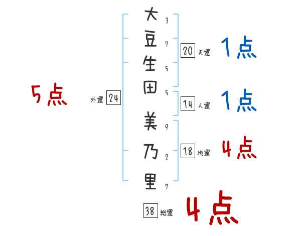 外運![]() | 大豆生田美乃里さんの外運は24画の5つ星!家庭運が良く順調な人生。金運にも恵まれる。 生活面を象徴する運勢です。外部から受ける影響力を表し、結婚運、家庭運や職場、環境への順応性を表します。 |