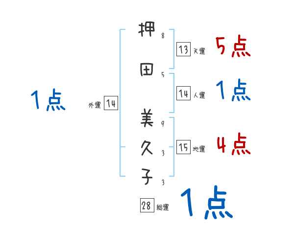 外運![]() | 押田美久子さんの外運は14画の1つ星!人に対して優しいがストレスを溜め込みがち。人間関係のトラブルを避けるよう気をつけましょう。 生活面を象徴する運勢です。外部から受ける影響力を表し、結婚運、家庭運や職場、環境への順応性を表します。 |