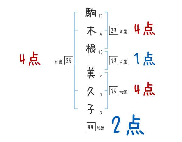 天運![]() | 駒木根美久子さんの天運は29画の4つ星!完全主義で才能がある。厳格な心の持ち主。 家系が持つ宿命的な運勢を表します。祖先から受け継いだ苗字ですので自分の力が及びません。家柄を象徴します。 |