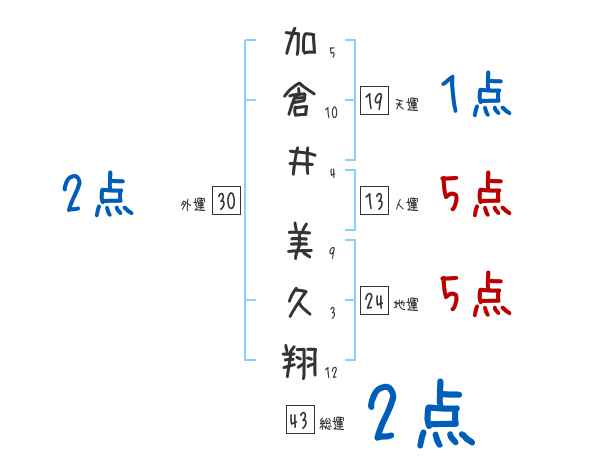 総運![]() | 加倉井美久翔さんの総運は43画の2つ星!頑固な性格で独立心が強いかも。やや非現実的で浪費に注意しましょう。 あなたの人生を表す1番重要な運勢です。生涯を通じて影響する総合運となり、主に50歳以降の晩年期に影響を及ぼします。 |