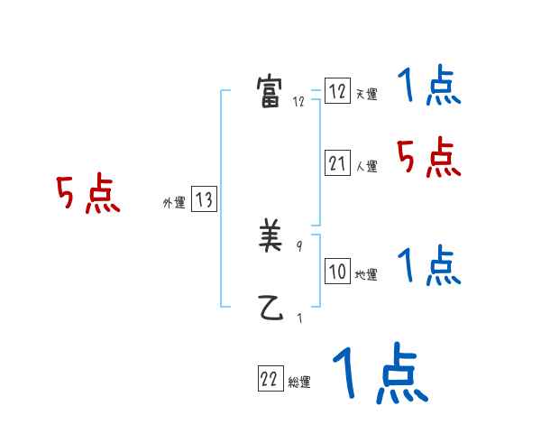 人運![]() | 富美乙さんの人運は21画の5つ星!統率力がある。独立し成功する。名誉を手に入れる。 性格や才能などを表す2番目に重要な運勢です。人間関係や協調性、社会的な成功に影響します。主に20歳から50歳ぐらいまでの中年期の運勢を表します。 |
