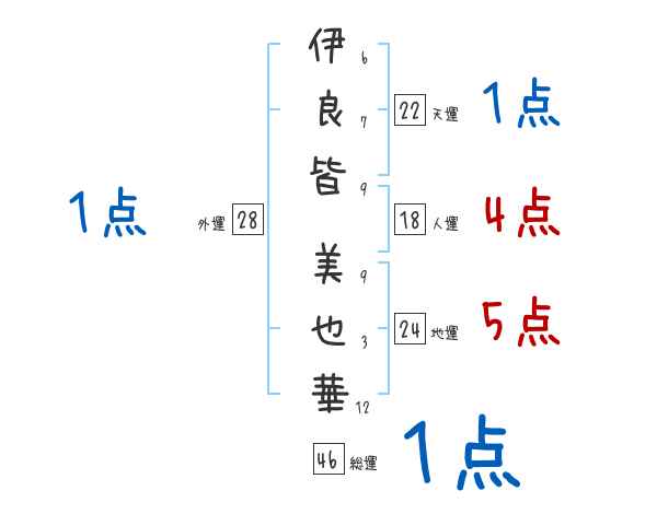 地運![]() | 伊良皆美也華さんの地運は24画の5つ星!家庭運が良く順調な人生。金運にも恵まれる。 個性を表す基礎的な運勢です。性格形成や対人関係、行動力など家庭環境に影響されます。主に誕生してから20歳くらいまでの若年期の運勢を表します。 |