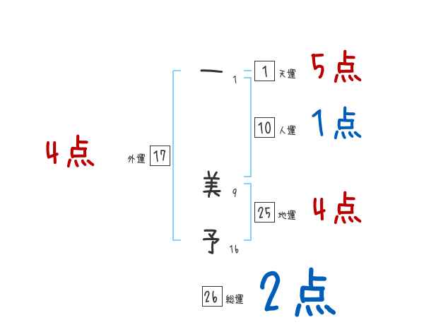 外運![]() | 一美予さんの外運は17画の4つ星!積極的な行動力。地位を気づき財産を手に入れる。純粋な心と直感力。 生活面を象徴する運勢です。外部から受ける影響力を表し、結婚運、家庭運や職場、環境への順応性を表します。 |
