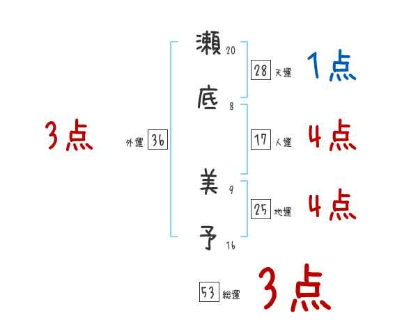 天運![]() | 瀬底美予さんの天運は28画の1つ星!家庭環境に注意。スポーツで活躍できる能力があるかも。 家系が持つ宿命的な運勢を表します。祖先から受け継いだ苗字ですので自分の力が及びません。家柄を象徴します。 |