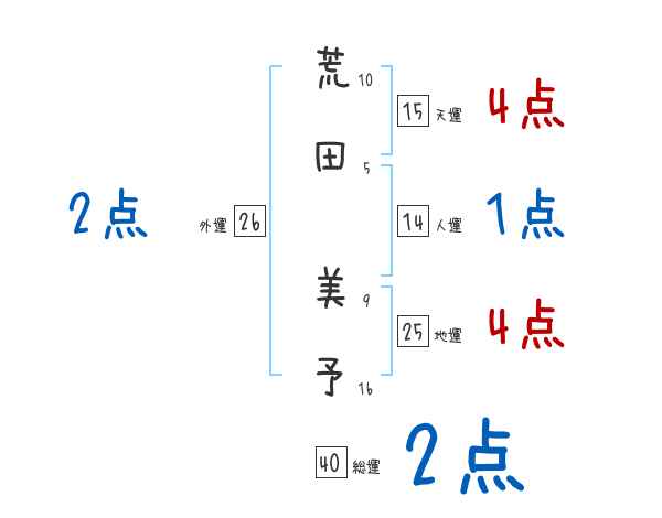 天運![]() | 荒田美予さんの天運は15画の4つ星!人徳があり出世する。順調に物事を進め円満な人生。 家系が持つ宿命的な運勢を表します。祖先から受け継いだ苗字ですので自分の力が及びません。家柄を象徴します。 |