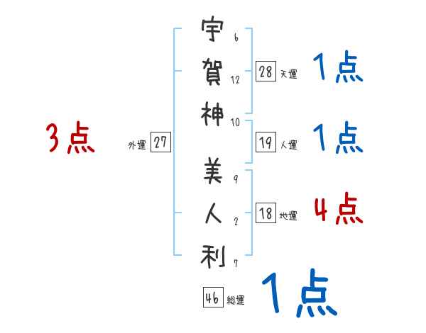 天運![]() | 宇賀神美人利さんの天運は28画の1つ星!家庭環境に注意。スポーツで活躍できる能力があるかも。 家系が持つ宿命的な運勢を表します。祖先から受け継いだ苗字ですので自分の力が及びません。家柄を象徴します。 |