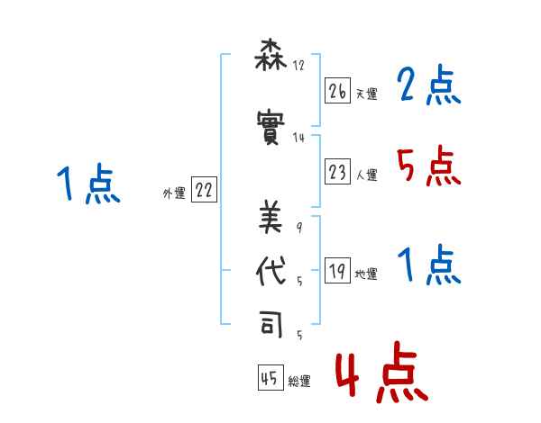 外運![]() | 森實美代司さんの外運は22画の1つ星!努力することが苦手ないっぽう手先が器用。芸術性にも優れる。 生活面を象徴する運勢です。外部から受ける影響力を表し、結婚運、家庭運や職場、環境への順応性を表します。 |