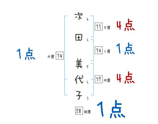 外運![]() | 次田美代子さんの外運は14画の1つ星!人に対して優しいがストレスを溜め込みがち。人間関係のトラブルを避けるよう気をつけましょう。 生活面を象徴する運勢です。外部から受ける影響力を表し、結婚運、家庭運や職場、環境への順応性を表します。 |