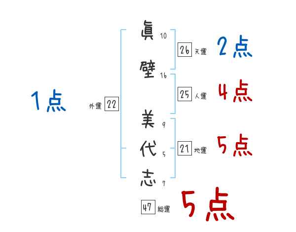 外運![]() | 眞壁美代志さんの外運は22画の1つ星!努力することが苦手ないっぽう手先が器用。芸術性にも優れる。 生活面を象徴する運勢です。外部から受ける影響力を表し、結婚運、家庭運や職場、環境への順応性を表します。 |