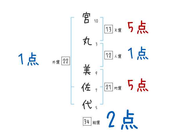 外運![]() | 宮丸美佐代さんの外運は22画の1つ星!努力することが苦手ないっぽう手先が器用。芸術性にも優れる。 生活面を象徴する運勢です。外部から受ける影響力を表し、結婚運、家庭運や職場、環境への順応性を表します。 |