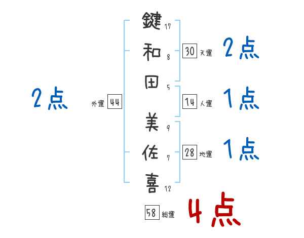天運![]() | 鍵和田美佐喜さんの天運は30画の2つ星!浮き沈みの激しさに注意しましょう。 家系が持つ宿命的な運勢を表します。祖先から受け継いだ苗字ですので自分の力が及びません。家柄を象徴します。 |