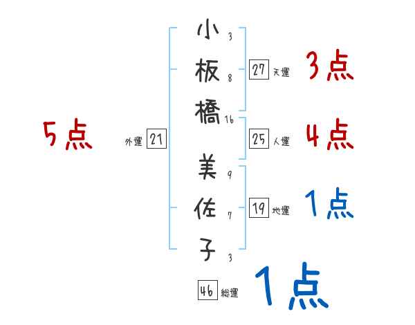 外運![]() | 小板橋美佐子さんの外運は21画の5つ星!統率力がある。独立し成功する。名誉を手に入れる。 生活面を象徴する運勢です。外部から受ける影響力を表し、結婚運、家庭運や職場、環境への順応性を表します。 |