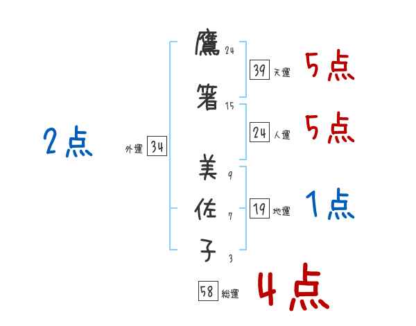 天運![]() | 鷹箸美佐子さんの天運は39画の5つ星!社交性に優れ人望が厚い。人の上に立ち成功する。 家系が持つ宿命的な運勢を表します。祖先から受け継いだ苗字ですので自分の力が及びません。家柄を象徴します。 |