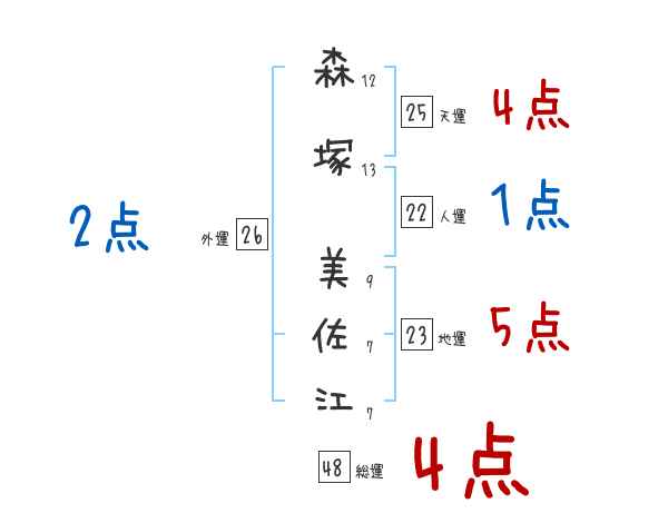 天運![]() | 森塚美佐江さんの天運は25画の4つ星!個性があり才能があふれる。強運の持ち主で発展する。 家系が持つ宿命的な運勢を表します。祖先から受け継いだ苗字ですので自分の力が及びません。家柄を象徴します。 |