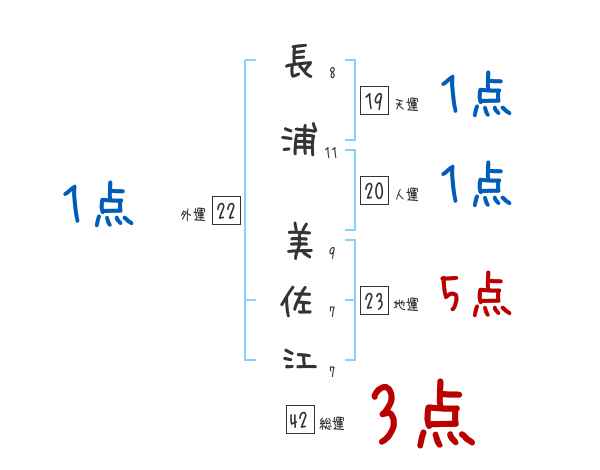 天運![]() | 長浦美佐江さんの天運は19画の1つ星!優れた才能を持ちますが、協調性が足りないことも。周りの人と協力する事を意識しましょう。 家系が持つ宿命的な運勢を表します。祖先から受け継いだ苗字ですので自分の力が及びません。家柄を象徴します。 |