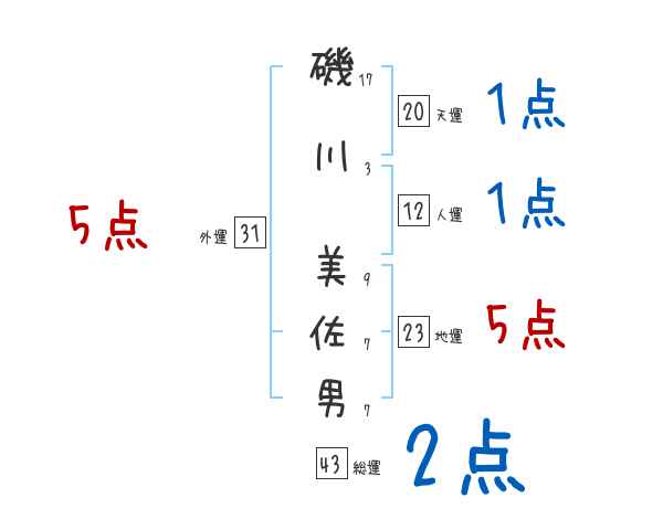総運![]() | 磯川美佐男さんの総運は43画の2つ星!頑固な性格で独立心が強いかも。やや非現実的で浪費に注意しましょう。 あなたの人生を表す1番重要な運勢です。生涯を通じて影響する総合運となり、主に50歳以降の晩年期に影響を及ぼします。 |