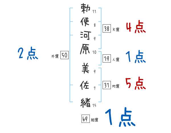 外運![]() | 勅使河原美佐緒さんの外運は50画の2つ星!浮き沈みが激しく不安定。しりすぼみに衰退しやすいので注意しましょう。 生活面を象徴する運勢です。外部から受ける影響力を表し、結婚運、家庭運や職場、環境への順応性を表します。 |