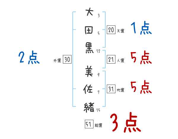 総運![]() | 大田黒美佐緒さんの総運は51画の3つ星!変化が激しく、危険に注意。堅実な性格。 あなたの人生を表す1番重要な運勢です。生涯を通じて影響する総合運となり、主に50歳以降の晩年期に影響を及ぼします。 |