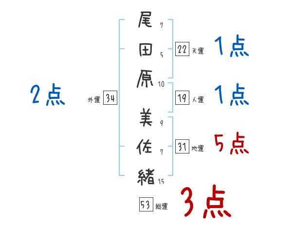総運![]() | 尾田原美佐緒さんの総運は53画の3つ星!やや見栄っ張りで虚栄心がある。散財に注意。 あなたの人生を表す1番重要な運勢です。生涯を通じて影響する総合運となり、主に50歳以降の晩年期に影響を及ぼします。 |