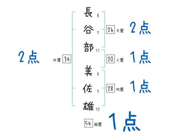 天運![]() | 長谷部美佐雄さんの天運は26画の2つ星!波瀾万丈かも。信頼できる人を大事にしましょう。 家系が持つ宿命的な運勢を表します。祖先から受け継いだ苗字ですので自分の力が及びません。家柄を象徴します。 |