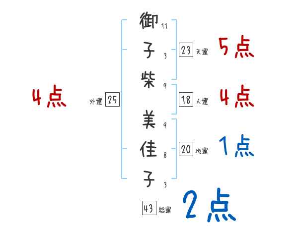 人運![]() | 御子柴美佳子さんの人運は18画の4つ星!情熱的で剛気。忍耐力があり信頼される。 性格や才能などを表す2番目に重要な運勢です。人間関係や協調性、社会的な成功に影響します。主に20歳から50歳ぐらいまでの中年期の運勢を表します。 |