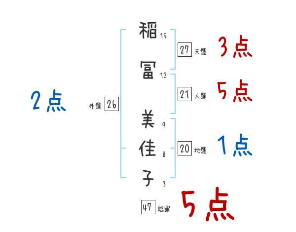 天運![]() | 稲冨美佳子さんの天運は27画の3つ星!頭脳明晰だが強情で摩擦が多い傾向。孤立に注意。 家系が持つ宿命的な運勢を表します。祖先から受け継いだ苗字ですので自分の力が及びません。家柄を象徴します。 |