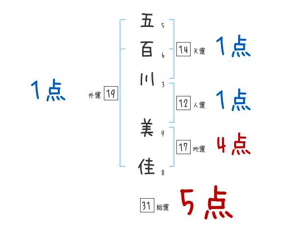 外運![]() | 五百川美佳さんの外運は19画の1つ星!優れた才能を持ちますが、協調性が足りないことも。周りの人と協力する事を意識しましょう。 生活面を象徴する運勢です。外部から受ける影響力を表し、結婚運、家庭運や職場、環境への順応性を表します。 |