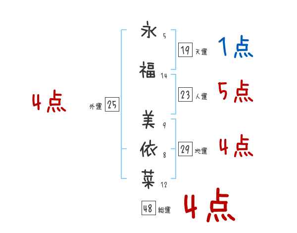 天運![]() | 永福美依菜さんの天運は19画の1つ星!優れた才能を持ちますが、協調性が足りないことも。周りの人と協力する事を意識しましょう。 家系が持つ宿命的な運勢を表します。祖先から受け継いだ苗字ですので自分の力が及びません。家柄を象徴します。 |