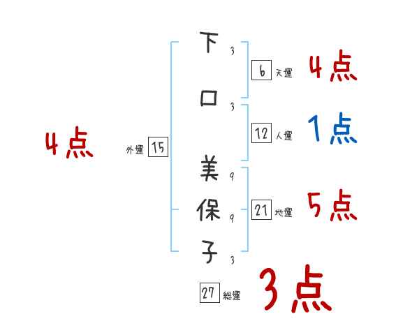 天運![]() | 下口美保子さんの天運は6画の4つ星!慎重な努力家で信頼を得る。誠実な精神で向上心に優れる。 家系が持つ宿命的な運勢を表します。祖先から受け継いだ苗字ですので自分の力が及びません。家柄を象徴します。 |
