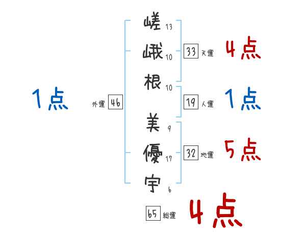 天運![]() | 嵯峨根美優宇さんの天運は33画の4つ星!権力志向でプライドが高い。勇気があり運を切り開き成功する。 家系が持つ宿命的な運勢を表します。祖先から受け継いだ苗字ですので自分の力が及びません。家柄を象徴します。 |