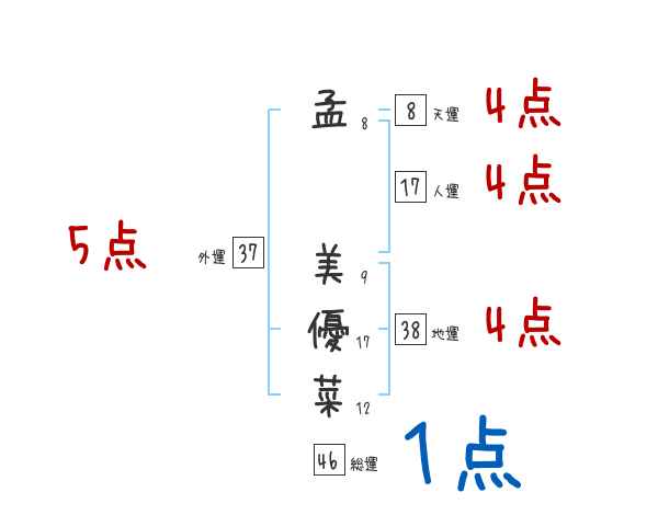 天運![]() | 孟美優菜さんの天運は8画の4つ星!勤勉家。根気強く努力し成功する。忍耐力がある。 家系が持つ宿命的な運勢を表します。祖先から受け継いだ苗字ですので自分の力が及びません。家柄を象徴します。 |