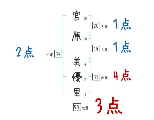 外運![]() | 宮原美優里さんの外運は34画の2つ星!独創性に優れるが、自尊心が強く災難に注意しましょう。 生活面を象徴する運勢です。外部から受ける影響力を表し、結婚運、家庭運や職場、環境への順応性を表します。 |