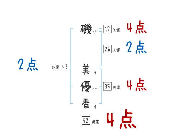 外運![]() | 磯美優香さんの外運は43画の2つ星!頑固な性格で独立心が強いかも。やや非現実的で浪費に注意しましょう。 生活面を象徴する運勢です。外部から受ける影響力を表し、結婚運、家庭運や職場、環境への順応性を表します。 |