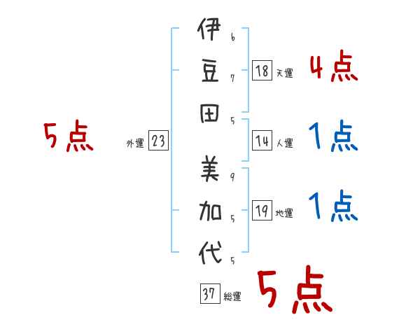 天運![]() | 伊豆田美加代さんの天運は18画の4つ星!情熱的で剛気。忍耐力があり信頼される。 家系が持つ宿命的な運勢を表します。祖先から受け継いだ苗字ですので自分の力が及びません。家柄を象徴します。 |