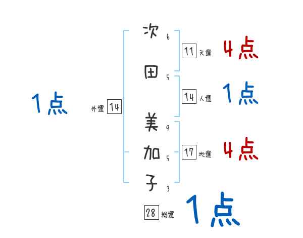 外運![]() | 次田美加子さんの外運は14画の1つ星!人に対して優しいがストレスを溜め込みがち。人間関係のトラブルを避けるよう気をつけましょう。 生活面を象徴する運勢です。外部から受ける影響力を表し、結婚運、家庭運や職場、環境への順応性を表します。 |