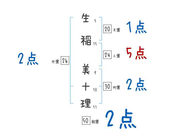 総運![]() | 生稲美十理さんの総運は50画の2つ星!浮き沈みが激しく不安定。しりすぼみに衰退しやすいので注意しましょう。 あなたの人生を表す1番重要な運勢です。生涯を通じて影響する総合運となり、主に50歳以降の晩年期に影響を及ぼします。 |