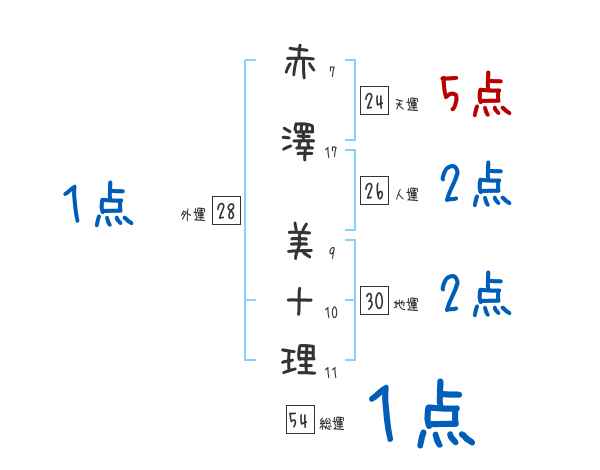 総運![]() | 赤澤美十理さんの総運は54画の1つ星!トラブルが多いかも。周りをよく見て協調して過ごしましょう。 あなたの人生を表す1番重要な運勢です。生涯を通じて影響する総合運となり、主に50歳以降の晩年期に影響を及ぼします。 |