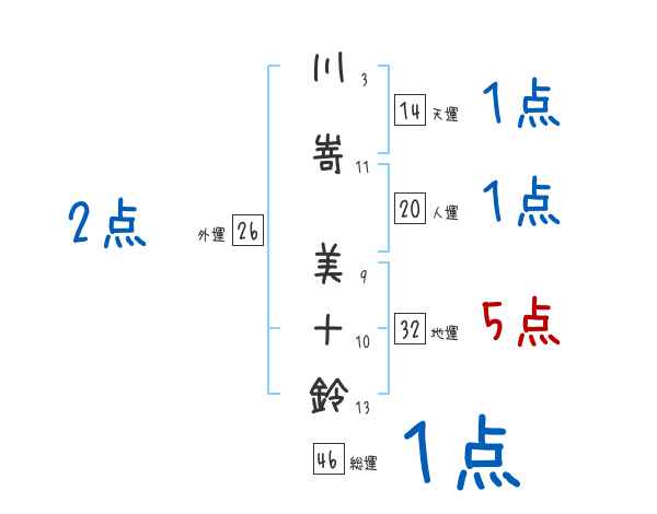 地運![]() | 川嵜美十鈴さんの地運は32画の5つ星!柔軟性があり成功する。チャンスが多く金運が良い。 個性を表す基礎的な運勢です。性格形成や対人関係、行動力など家庭環境に影響されます。主に誕生してから20歳くらいまでの若年期の運勢を表します。 |