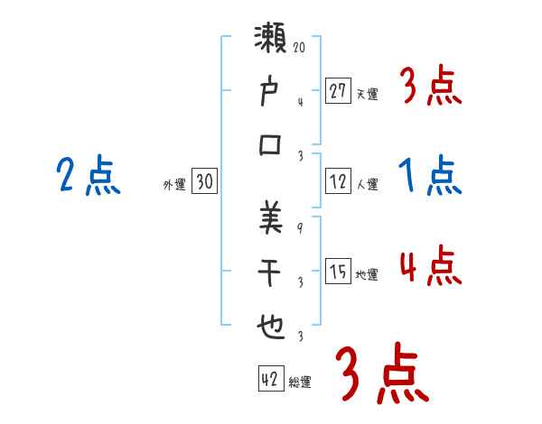 総運![]() | 瀬戸口美千也さんの総運は42画の3つ星!病気に注意。多芸であるが消極的でおとなしい。 あなたの人生を表す1番重要な運勢です。生涯を通じて影響する総合運となり、主に50歳以降の晩年期に影響を及ぼします。 |