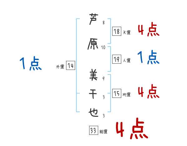 外運![]() | 芦原美千也さんの外運は14画の1つ星!人に対して優しいがストレスを溜め込みがち。人間関係のトラブルを避けるよう気をつけましょう。 生活面を象徴する運勢です。外部から受ける影響力を表し、結婚運、家庭運や職場、環境への順応性を表します。 |