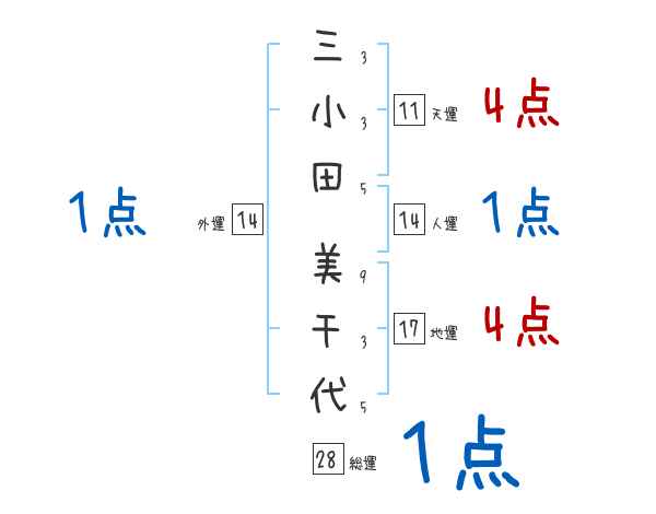 外運![]() | 三小田美千代さんの外運は14画の1つ星!人に対して優しいがストレスを溜め込みがち。人間関係のトラブルを避けるよう気をつけましょう。 生活面を象徴する運勢です。外部から受ける影響力を表し、結婚運、家庭運や職場、環境への順応性を表します。 |