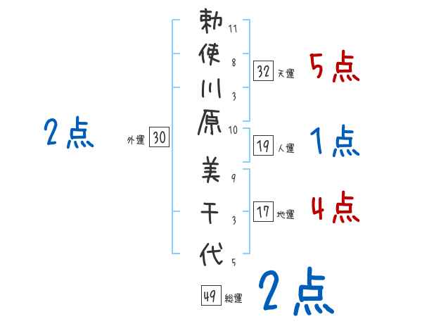 天運![]() | 勅使川原美千代さんの天運は32画の5つ星!柔軟性があり成功する。チャンスが多く金運が良い。 家系が持つ宿命的な運勢を表します。祖先から受け継いだ苗字ですので自分の力が及びません。家柄を象徴します。 |